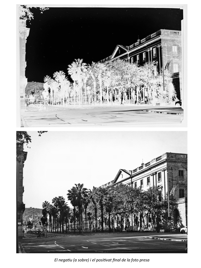 Això no obstant, no sembla possible que el punt des del qual es va fotografiar el que avui és la plaça de Palau fos el mateix que assenyala la placa. L’evidència és tan senzilla com que des d’aquell lloc no s’obté l’enquadrament fotografiat. Si ens fiem del gravat, l’alçada o angle des del qual es devia fer la exposició tampoc es correspon a cap dels terrats mencionats i mirant a la plaça. En canvi, allò que sembla més plausible és que es fes des d’un dels balcons laterals de l’edifici de la llavors Duana. Allí semblen coincidir l’angle facilitat per l’alçada del balcó i l’enquadrament del que s’observa al gravat.